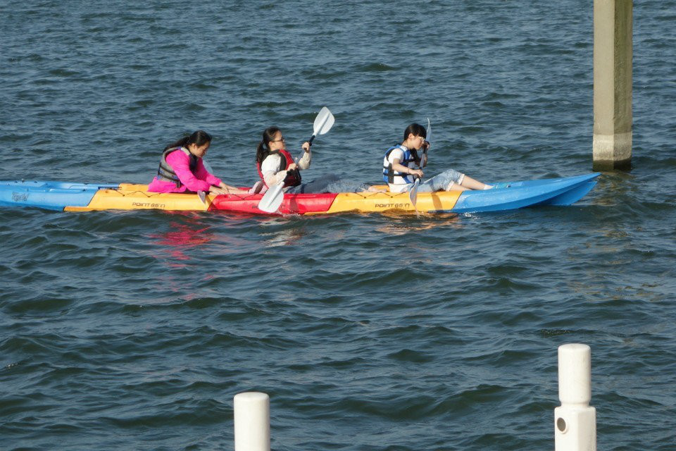 我们会考虑天气的因素,皮划艇教练也会根据水上风浪情况,适当的调整时间,确保皮划艇课程的顺利进行,在这之前也会反复叮嘱学生做好防晒工作。